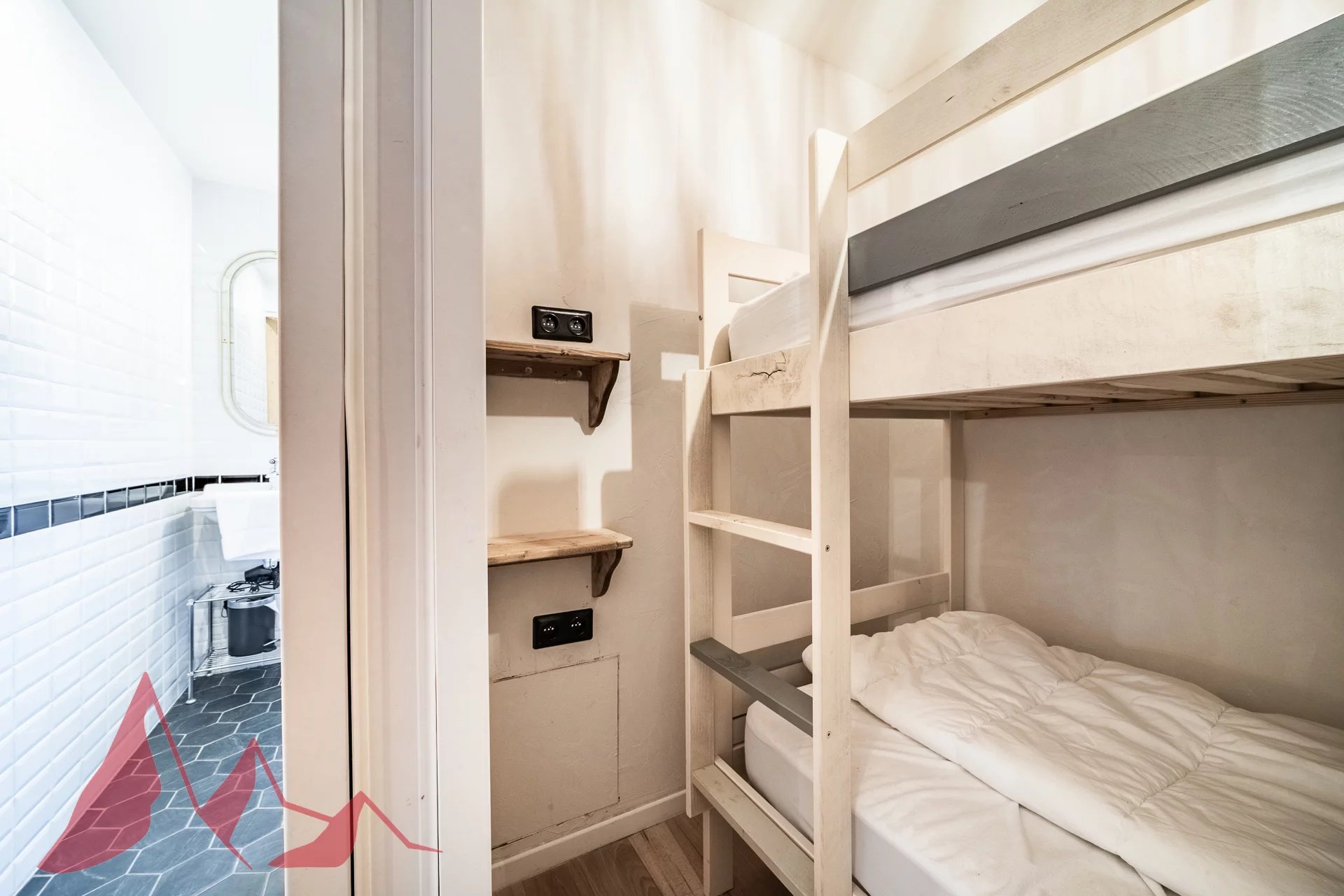 It comprises an entrance hall with cupboard, a spacious living room with kitchen opening onto the balcony, a bedroom with double bed, a sleeping area with bunk beds and a shower room.