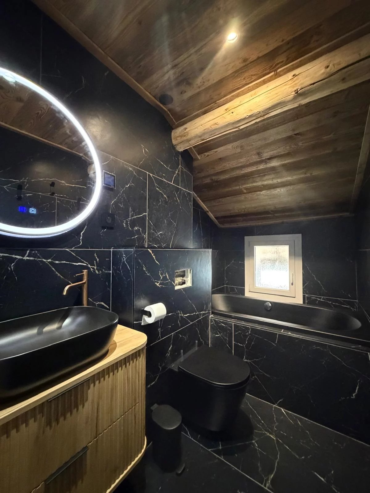 Mineral finishes: Bathrooms clad in large, dark, stone-look tiles, complemented by sleek fittings.