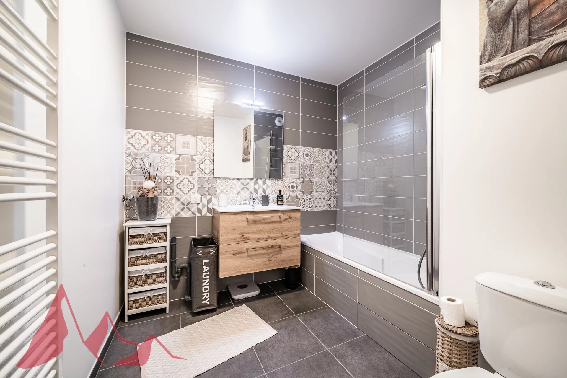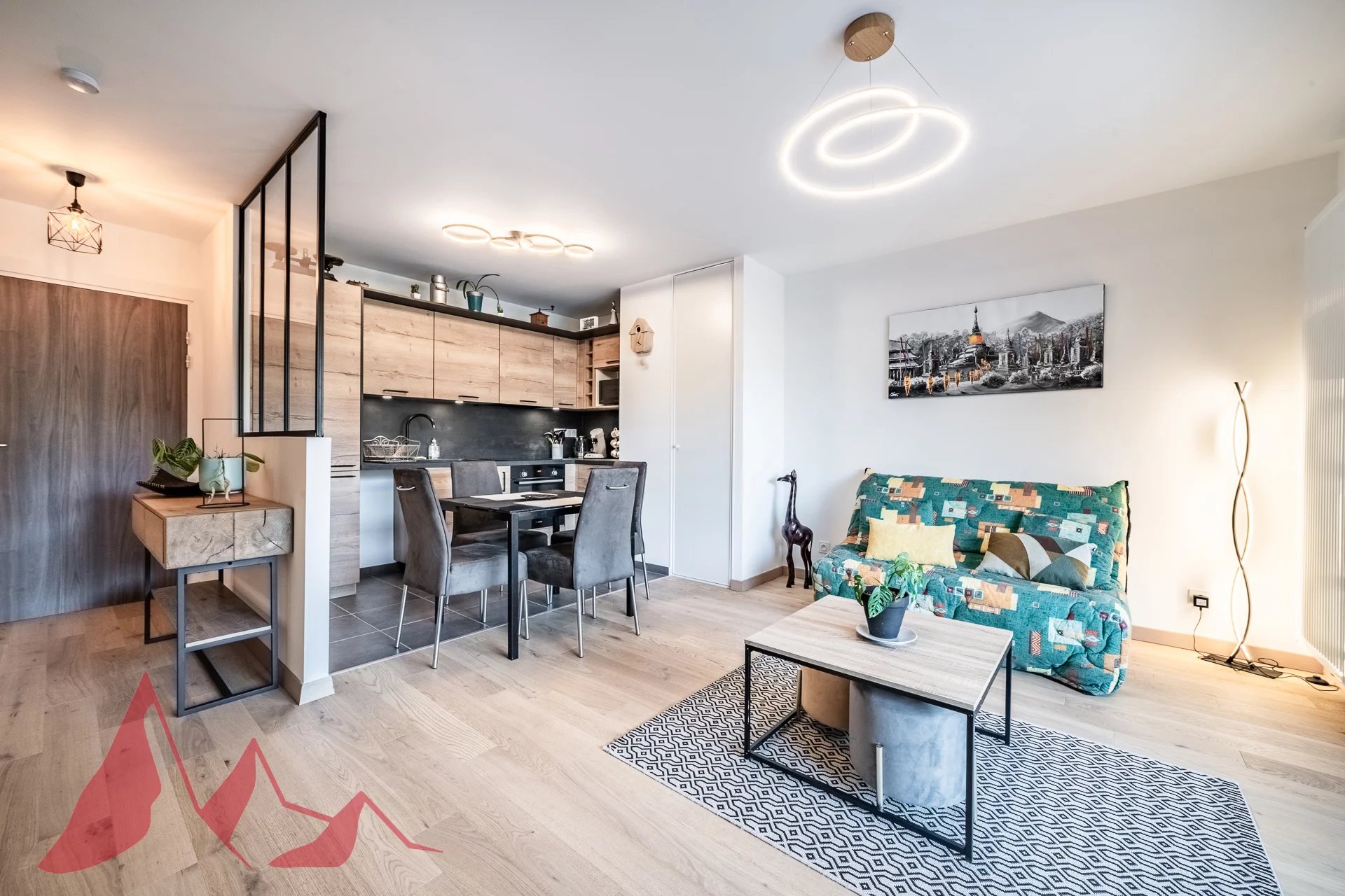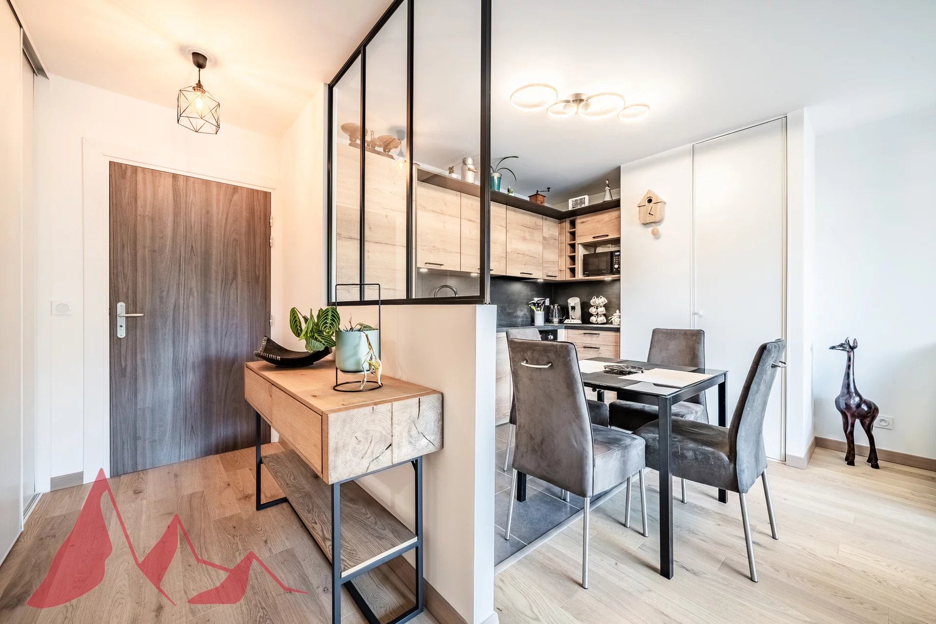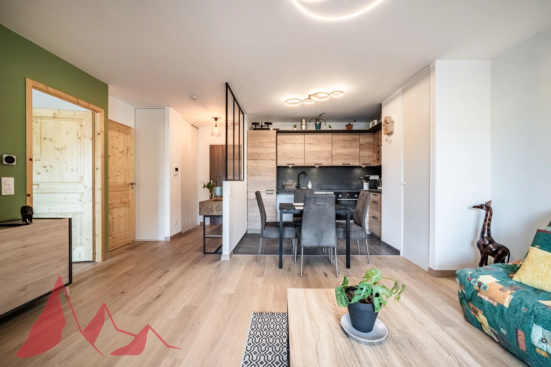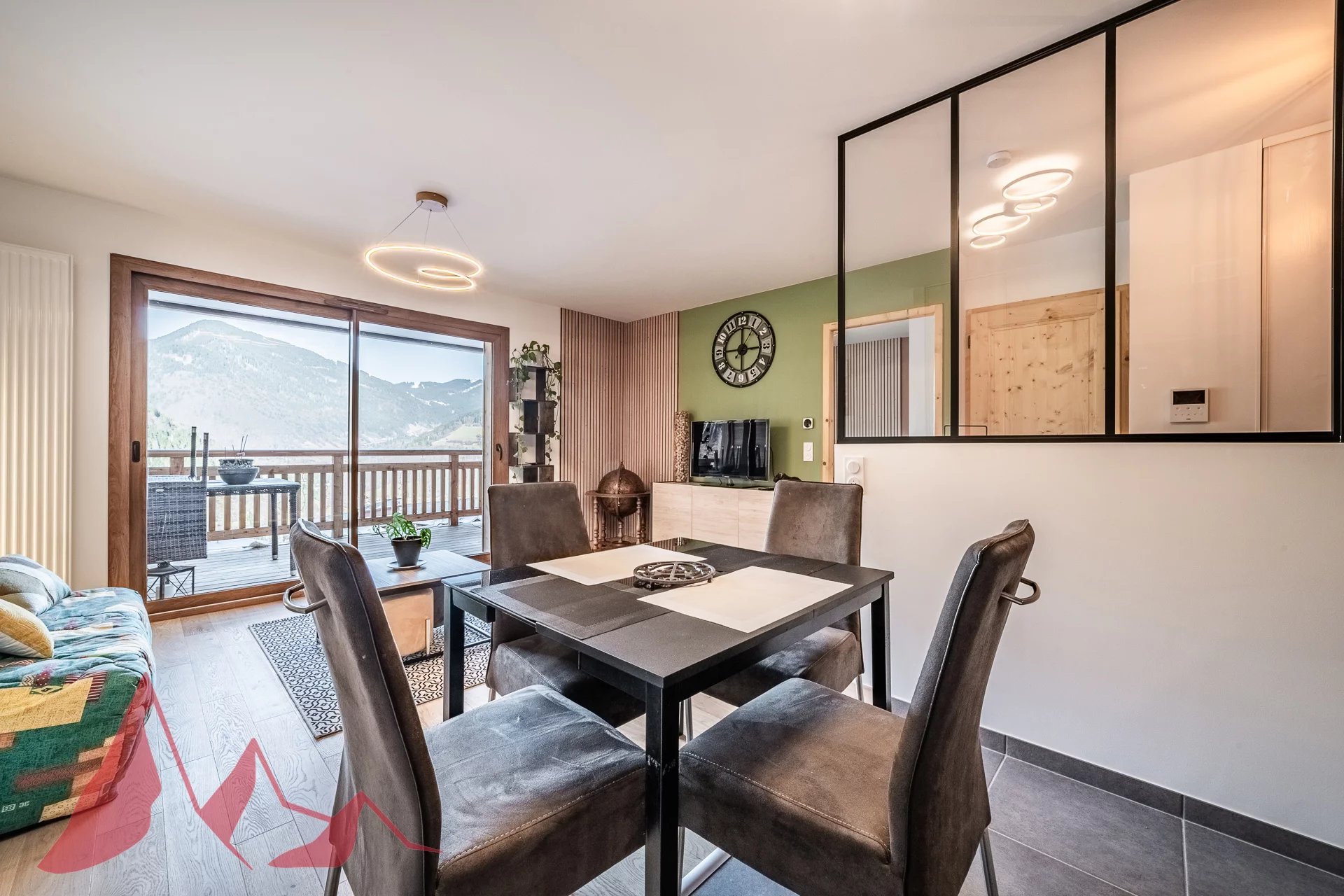 Day area : Entrance hall with storage space and interior glass roof providing brightness and cachet, leading to a large living room with fitted kitchen. Direct access to a large terrace facing the mountains.